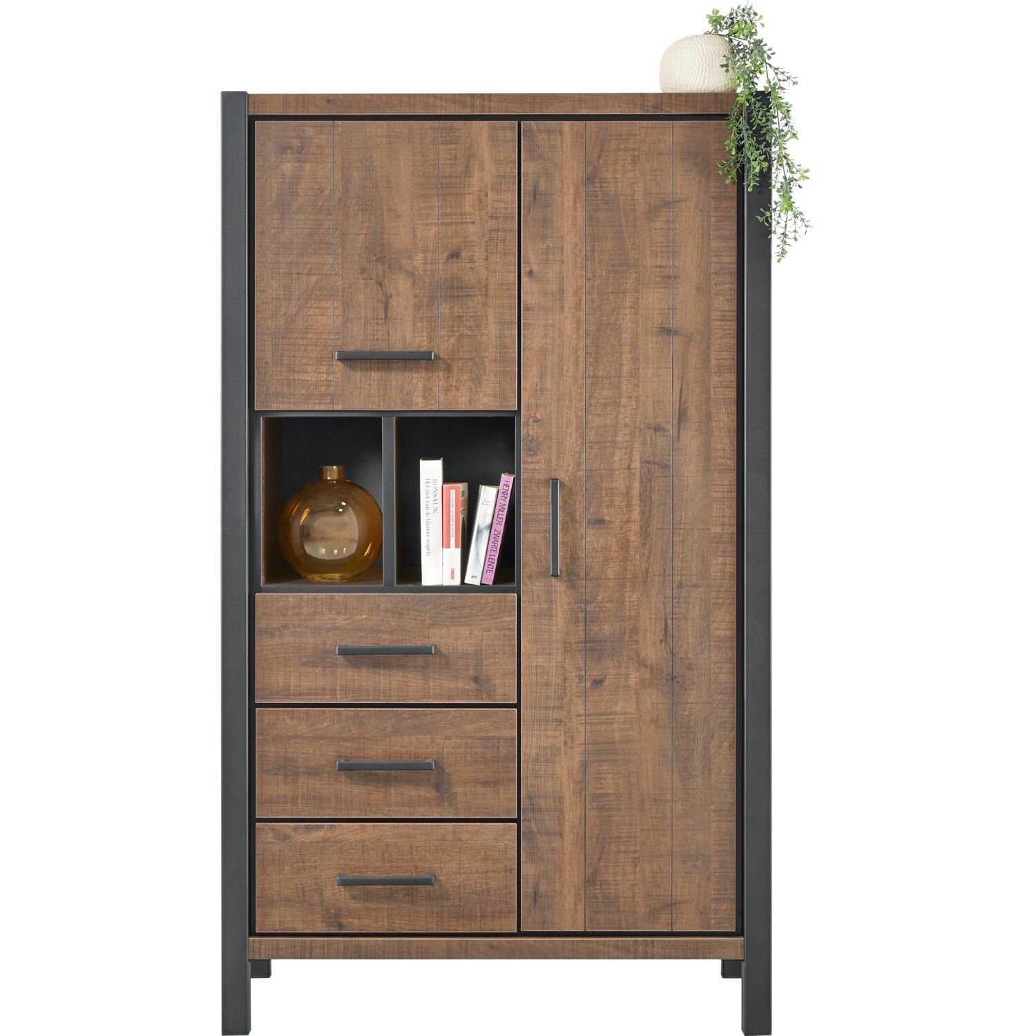De opbergkast heeft de uitstraling van massief hout. Het beschikt over 2 deuren, 3 laden en 2 open vakken. Achter de kleine deur zit 1 vaste legplank, achter de grote deur zitten 3 vaste legplanken. Daarmee kun je veel spullen opbergen en enkele accessoires zichtbaar opstellen. De kast is eenvoudig te monteren middels de bijgeleverde handleiding. Daarnaast is de opbergkast goed te combineren met de andere meubels uit de serie van Mantera.