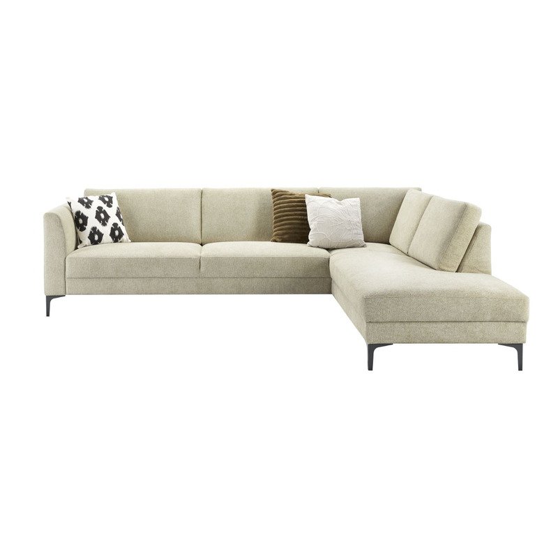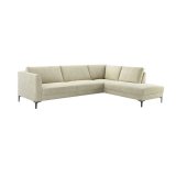 Hoekbank Gulnare is een ranke, strak vormgegeven hoekbank die zich in vrijwel ieder interieur thuis voelt. De bank is uitgevoerd in een gemêleerde weefstof met verschillende beige tinten, vleugje groen en een subtiele glans. Deze licht meerkleurige kwaliteit heeft een wat grovere structuur, maar wel een erg zachte touch. De zwart metalen poten zijn 15 cm hoog en maken de bank helemaal af.