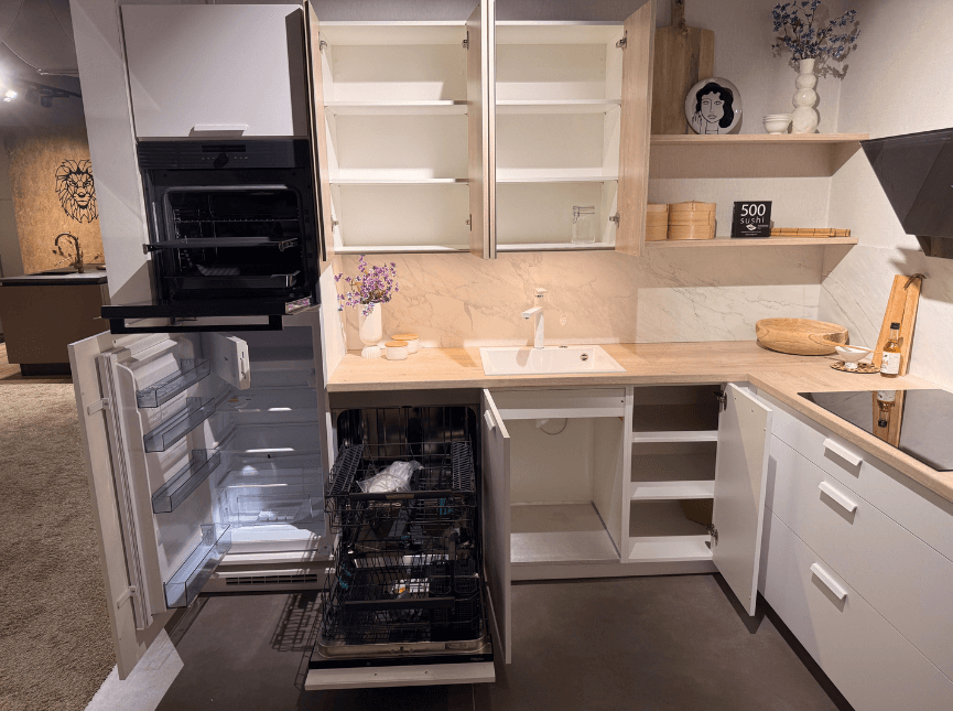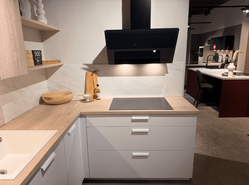 De Trent Alpinwit / Nancy Eiken straalt tijdloze elegantie uit met supermatte fronten en lichte houtaccenten. Minimalistisch en fris, met rust en ruimte voor koken en wonen. Dit showroommodel is direct beschikbaar met aantrekkelijk prijsvoordeel – een perfecte keuze voor wie een cleane, hoogwaardige keuken wil zonder wachttijd.